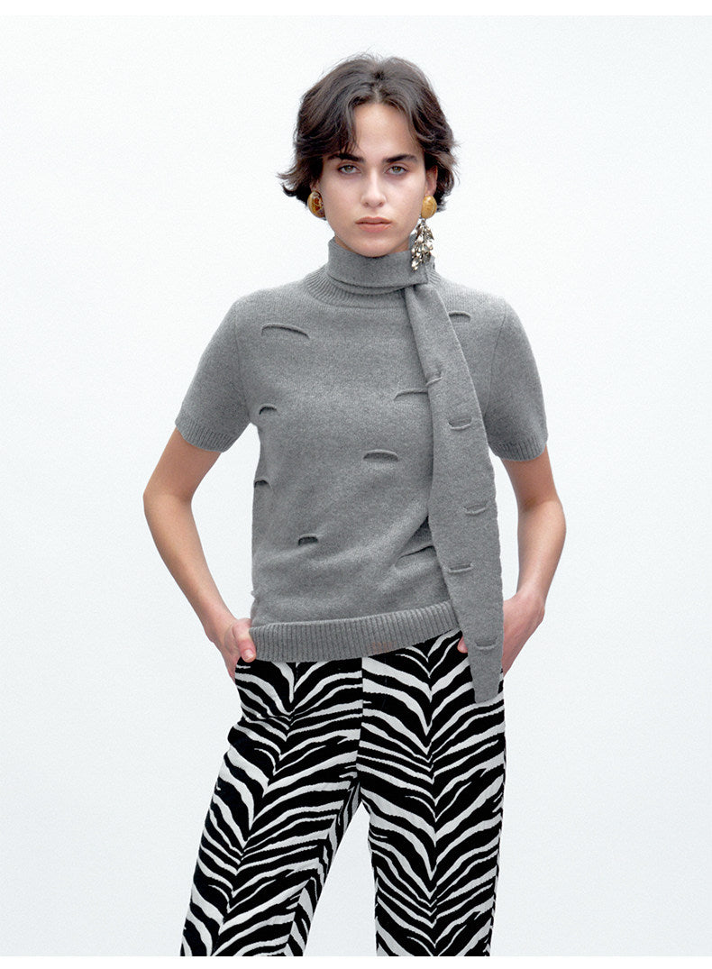 Grey Cut-Out Distressed Wool Short-Sleeve Knit Top