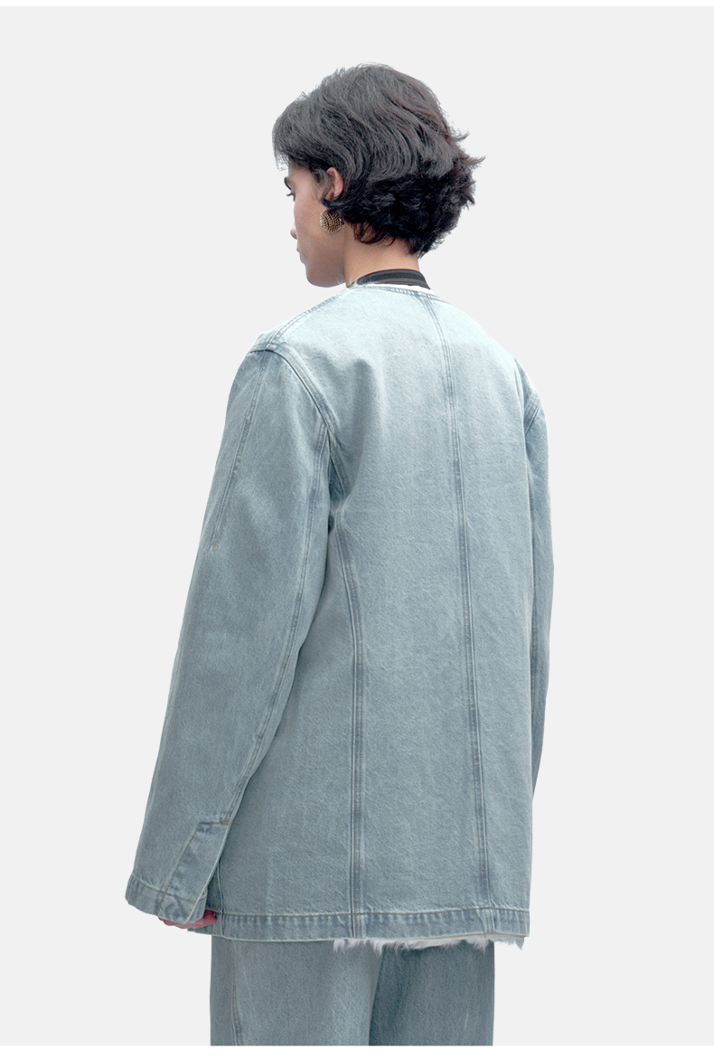 Women's Minimalist Design Denim Collarless Jacket Coat with Fur Inner Lining